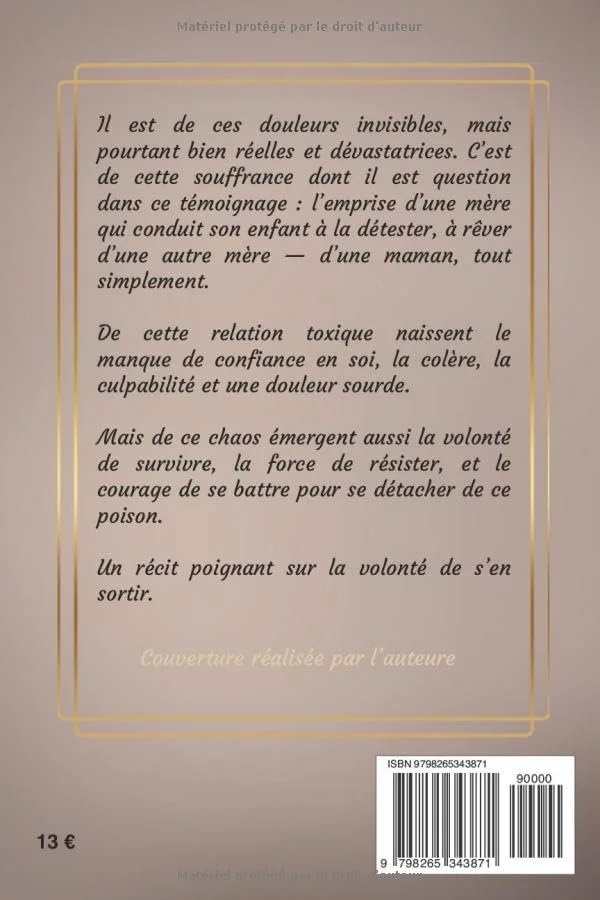 Quatrième couverture : Il est de ces douleurs qui ne se voient pas, pourtant bien réelles et dévastatrices, c'est de cette souffrance dont il sera question dans ce témoignage. L'emprise d'une mère qui amène son enfant à la détester, à rêver d'une autre mère, d'une maman plus exactement. En découlent le manque de confiance en soi, la colère, la douleur, mais aussi la volonté et la force de se battre pour se détacher de ce poison.