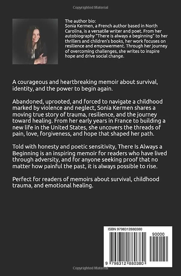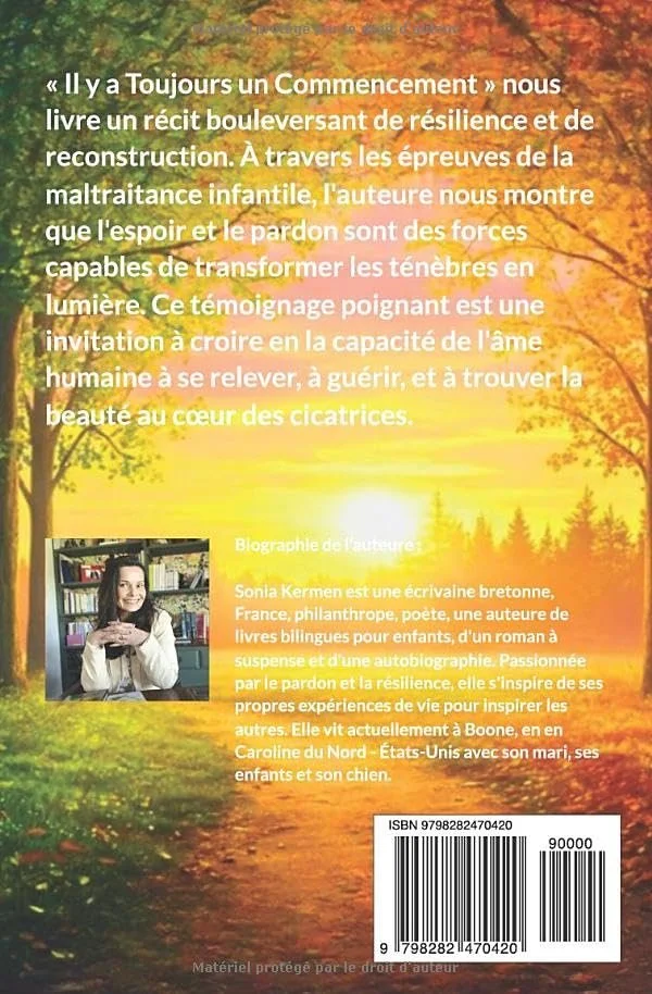 A French author of Breton origin who has been living in the United States for 18 years (she currently resides in Boone, North Carolina, after having lived in California and Colorado). Renowned for her literary versatility, she has published a wide variety of works, including an autobiography, a thriller, poetry collections, and bilingual children's books. Her writing, deeply rooted in the themes of forgiveness and resilience, is inspired by her personal journey (psychology and teaching). Also a philanthropist, Sonia uses literature not only to inspire, but also to encourage collective creation. She is the co-author of participatory anthologies and will contribute to the collective work “Le Jour Où Elles Se Sont Choisies (The Day They Chose Each Other, to be published in March 2026, Mindset Editions), a hymn to female empowerment. When she is not writing, Sonia Kermen finds inspiration in her passions: photography, cooking, hiking, and reading.